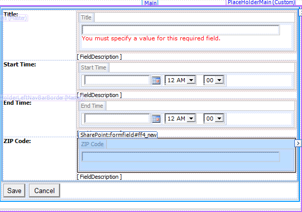 Let’s use an example where you want to validate a US ZIP Code on your NewForm.aspx for a list. The first steps are to create your list with whatever columns you want , including the ZIP Code column as a Sinlge line of text; copy NewForm.aspx (never edit the original in case you need it!); remove the default List Form Web Part (LFWP); and add your own Data View Web Part (DVWP). Some folks out there will tell you that you should leave the default LFWP on the page and hide it to avoid problems; I think this is a holdover from SharePoint 2003 as I’ve never had any issues with removing it. I’ll gloss over the details on these first steps, as I cover them in other posts.