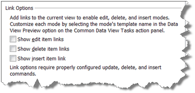 In this <xsl:if>, we’re testing the value of the $dvt_1_automode variable, and if it is ‘1’, then the contained code will be executed, which outputs a table header cell (TH). (This header cell will be shown if you turn on any of the Edit options in the Data View Properties, as shown.) I’ve never seen a cogent explanation for what the ddwrt:cf_ignore function does; if you know, please leave a comment!