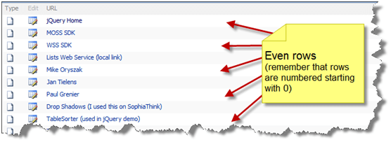 This <xsl:if> is checking to see if the current item is in an odd or even row. (If you are unfamiliar with the modulus, or mod, function, it returns the remainder when you divide the first value by the second.) The position() gives us the row number in the rowset. If the row number is odd, we apply the ms-alternating CSS class. This is the class that shows alternating white and light grey rows in List View Web Parts (LVWPs) in SharePoint out of the box.