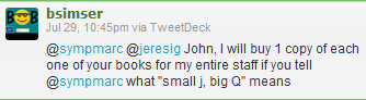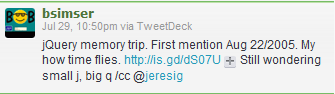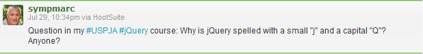 You’ve gotta love Twitter. Yesterday, Greg Schaefer asked in the forums for my Enhancing the User Experience with jQuery course at USPJ Academy why jQuery is spelled the way it is. I had no idea, so off to the InterWebs. I didn’t see an obvious answer after a little Binging, so I figured I’d tweet the question: