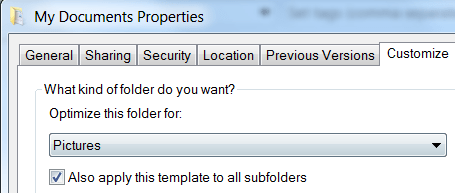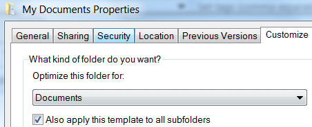You make this change by right-clicking on the folder and going to the Customize tab. If you try to change this setting on a folder and can’t find the Customize tab, then you need to navigate directly to the folder rather than through a dynamic link. What this meant in my case was to navigate to C:\Users\Marc D Anderson\Documents rather than going to the same place via Libraries –> Documents –> My Documents.