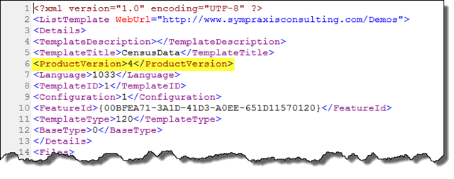 Next, extract the manifest.xml file from the CAB file. You can then edit the manifest.xml file in any program you choose – I love SharePoint Designer, so that’s what I’m using. Near the top of the file, you’ll see where the SharePoint version is specified: