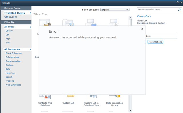 You should now be able to create a new list based on the template you just uploaded without any problems. I’ve done 4 lists so far with no bad side effects that I can discern. Note that you will need to reconnect any Lookup columns, though, so if you are using a lot of them (like I am), then this isn’t such a great method.