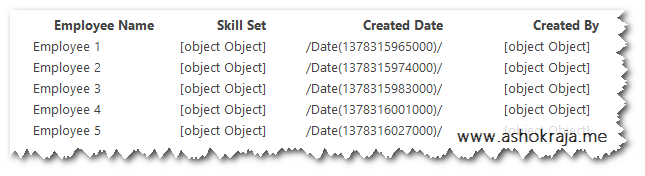 Well, let’s see what’s there in the above code. If you notice the code, except for spDate, spUser and spChoice in the data-bind attribute, all the remaining code is related to typical Knockout view and View Modal. The data binding handlers starting with “sp” are related to KoSp and it takes care of parsing and formatting the data.